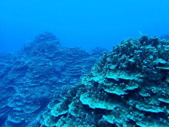 午後から雨も降り出し、水中の方が暖かな感じでした。 2本目で久し振りに潜ったパラオハマサンゴの群生。 白化は全くしておらず、ホッと一安心。 水深もあるのですが、白化に強いサンゴのようです。 |