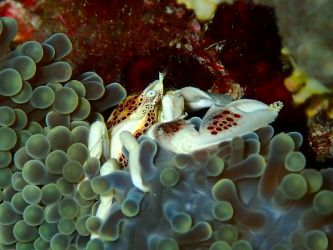 いつもはイソギンチャクに包まっているセジロクマノミが元気に泳ぎ回って、その横でアカホシカミダマシが姿を現していました。